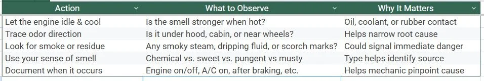 If it’s oil, plastic, coolant, or exhaust smell, don’t ignore it